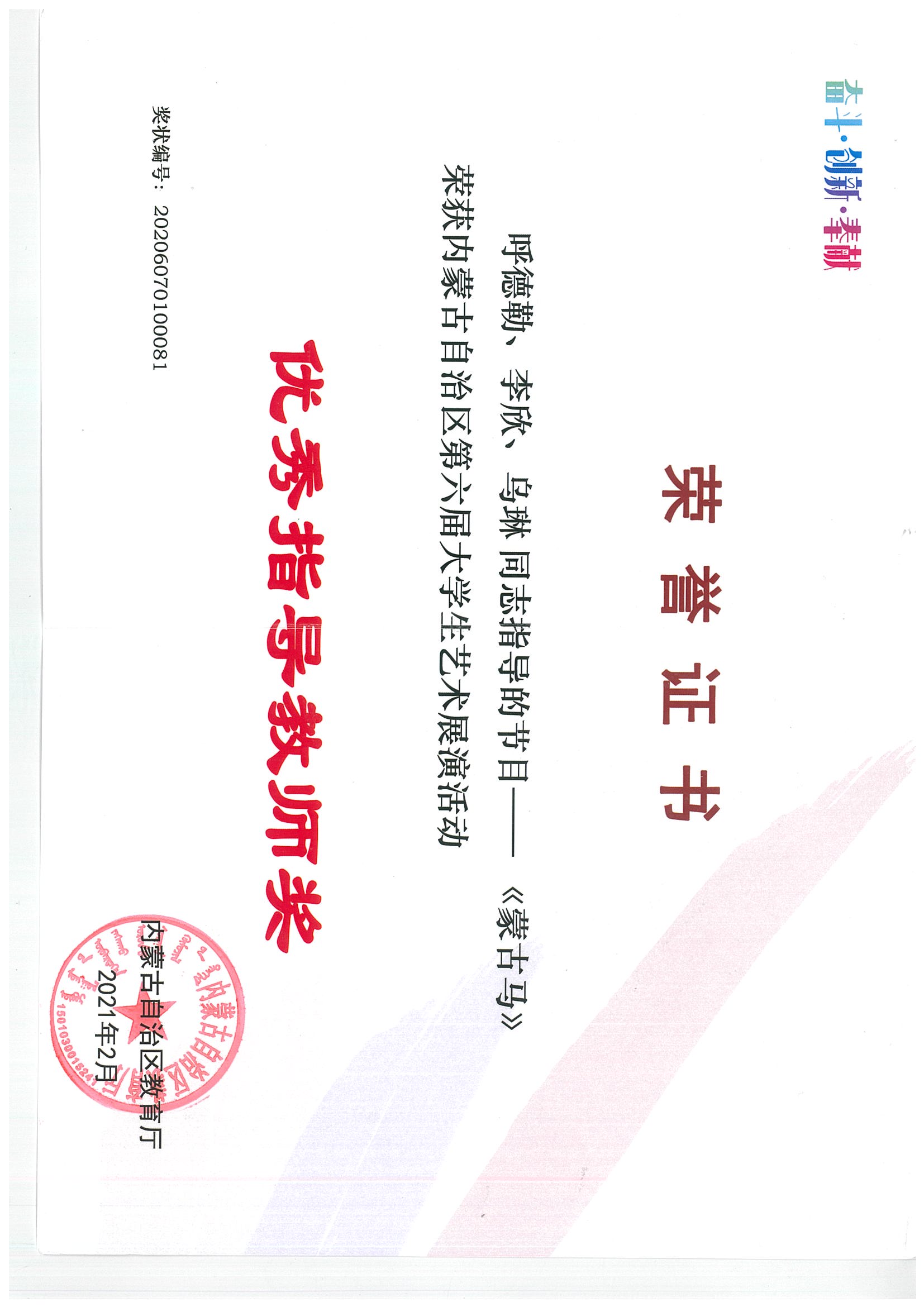 《蒙古马》—内蒙古自治区教育厅全区第六届大学生艺术展演“优秀指导教师奖”